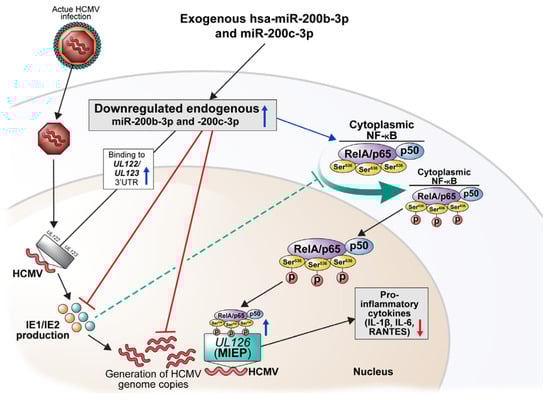 This study on acute HCMV infection showed that the p-Ser536 RelA/p65 negatively affects IE protein levels and NF-κB activity by binding to MIEP. The expression of IE proteins is associated with inhibition of the phosphorylation of RelA/p65 at Ser536, and the levels of p-Ser536 RelA/p65 are decreased during acute lytic infection of HCMV when IE proteins are expressed. Contrary to these findings, the upregulation of miR-200b-3p and miR-200c-3p which helps downregulate the expression of IE72 and IE86 resulted in increased p-Ser536 RelA/p65 expression. This could competitively interrupt the binding of NF-κB to MIEP and then inhibit the production of pro-inflammatory cytokines. Therefore, we propose that increasing the levels of miR-200b-3p and miR-200c-3p can result in the regulation of lytic replication of HCMV (Figure 8).