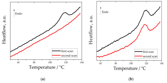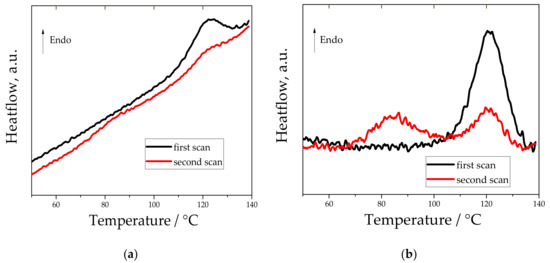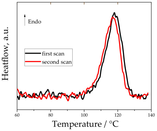 After baseline correction, the comparison of the first and the second scans after annealing for 600 s reveals that the endothermal effect is almost completely restored in some experiments with a minor temperature shift (Figure 2). The restoration of the endotherm also means negligible contribution of aggregation, confirming the previous results where no aggregation was found in glycerol after even prolonged heating [23] using the dynamic light scattering technique.