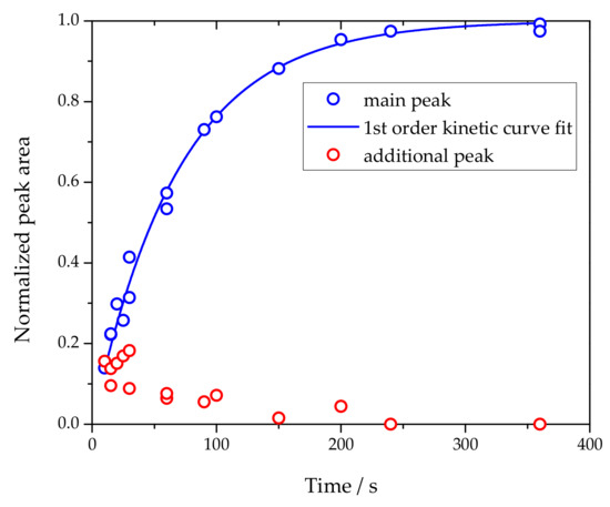 Progress curves of the main and additional low-temperature peaks during annealing at 40 °C. The peak areas were normalized by diving by the peak area from the first scan. Symbols represent experimental values, and the line fit is of the experimental data for the main peak area with a 1st order kinetic curve.
