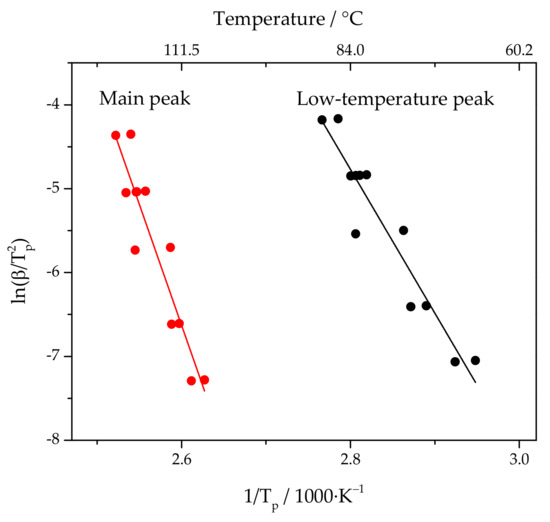 Kissinger plot of the peak temperatures (Tp) of main and low-temperature peaks.
