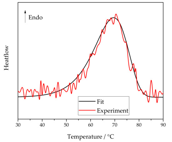 We also may estimate the activation parameters of the unfolding of the intermediate from the Kissinger plot. For the main peak, we get the apparent activation energy of the corresponding process to be 240 ± 29 kJ/mol, which agrees with the previous estimate [23], and for the low-temperature peak, we get the apparent activation energy of 142 ± 14 kJ/mol. Furthermore, the numerical fit of the low-temperature endotherm produces a value of activation energy of 139 kJ/mol and a good quality fit (Figure 9). In terms of the transition state theory, the activation enthalpy of the intermediate is 136 kJ/mol and the activation entropy is 174 J/mol·K.