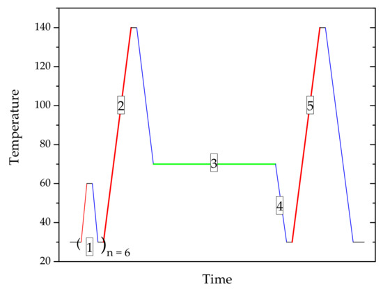 The temperature–time profile for investigating lysozyme refolding in glycerol using the FSC technique. (1) heating and cooling cycles to stabilize the sample, (2) first heating scan, (3) annealing isotherm for refolding of the protein (temperature and duration of the isotherm are varied), (4) cooling step to reach a starting temperature for the heating scan, and (5) second heating scan to evaluate the properties of the protein ensemble created during segment 3.