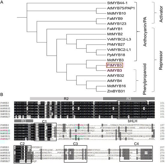 Molecular identification of FtMYB3. (A) Phylogenetic tree derived from amino acid sequences of R2R3-MYB TFs in Tartary buckwheat and other species. GenBank accession numbers are as follows: StMYB44-1 (QCH00894.1), AtMYB75 (Q9FE25.1), MdMYB10 (ACQ45201.1), FaMYB9 (JQ989281.1), AtMYB123 (Q9FJA2.1), FaMYB1 (AF401220), MtMYB2 (XP_003616388.1), VvMYBC2-L3 (KM046932), PhMYB27 (AHX24372.1), VvMYBC2-L1 (ABW34393), PpMYB8 (ACA33844.1), MdMYB3 (AEX08668.1), FtMYB3 (AEC32978.1), AtMYB3 (BAA21618.1), AtMYB32 (EFH43356.1), AtMYB4 (BAA21619), MdMYB16 (ADL36756.1), ZmMYB31 (NP_001105949). FtMYB3 is highlighted with a red box. (B) Multiple sequence alignments of MYB3. Conserved residues are highlighted in black and partial conservation is shown in grey. The R2 and R3 domains are indicated in greyish white and grey boxes, respectively. Conserved motifs in the C terminus are boxed and numbered as C1~C4. Identical and similar amino acid residues are marked in black and grey, respectively.