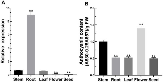 The transcription level of FtMYB3 and anthocyanin content in different organs. Tartary buckwheat roots, stems, leaves, flowers, and seeds were collected at 40 days after sowing for the analysis of gene expression pattern and the determination of anthocyanin content. (A) FtMYB3 expression level in different organs; (B) Anthocyanin content in various organs. The accumulation of anthocyanin content and gene expression level in stems are defined as “1”. ** means extremely significant difference at p < 0.01 level; Error bars reflect ± SDs.