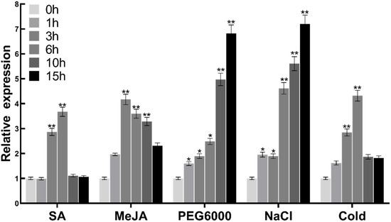 Expression of FtMYB3 in Tartary buckwheat under different treatments (1 mmol/L SA, 2 mmol/L MeJA, 30% PEG6000, 150 mmol/L NaCl). The samples were collected after respective treatments for 0, 1, 3, 6, 10, and 15 h. The relative expression of FtMYB3 was analyzed by qPCR, and the expression level of FtMYB3 at 0 h was defined as 1. The expression level was calculated from three replicates. Error bars denote ± SDs. ** means extremely significant difference at p < 0.01 level; * means significant difference at p < 0.05 level.