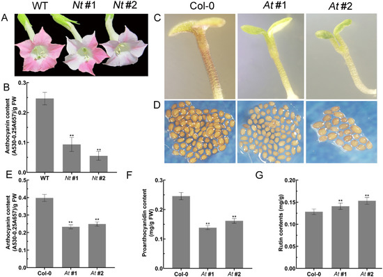 Phenotype of transgenic tobacco (termed Nt #1, Nt #2) and Arabidopsis (named At #1, At #2) overexpressing FtMYB3. (A,B) Floral phenotypes and total anthocyanin of WT and two transgenic Nt #1 and Nt #2 at the flowering stage; (C) Pigmentation of 6-day-old seedlings in Arabidopsis WT (termed Col-0) and transgenic lines At #1 and At #2 after 24 h treatment under 4 °C; (D) Colour of seed coats in the same Arabidopsis as above without treatments; (E–G) Anthocyanin, PA and rutin content in the same Arabidopsis at the flowering phase. Error bars represent ± SDs. ** means extremely significant difference at p < 0.01 level.