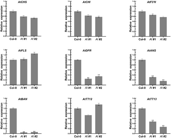 The expression level of enzyme genes in the flavonoid metabolic pathway in Arabidopsis overexpressing FtMYB3 (At #1 and At #2) compared with those in Col-0. The mRNA abundances of 9 genes were monitored by qRT-PCR in the 4-week-old seedings of Col-0, At #1, and At #2, respectively. The 2−ΔΔCT method was used to evaluate the relative expression, and AtActin2 was used as a reference gene. Error bars represent ± SDs. ** means extremely significant difference at p < 0.01 level.