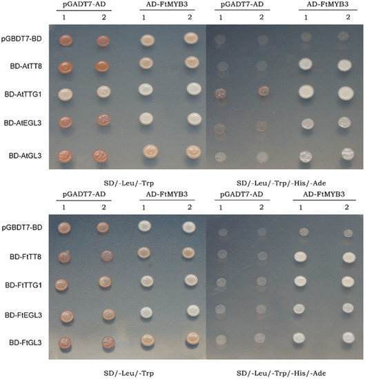 Interaction proteins of FtMYB3. FtMYB3 was fused to the pGADT7 vector, and FtTT8, FtTTG1, FtEGL3, or FtGL3 was fused to the pGBKT7 vector. SD/-Trp-Leu medium was used to screen the transformation for plasmids, and SD/-Leu-Leu-His-Ade medium was used to screen the transcriptional activation of HIS3 gene. Colony growth was monitored after 7 days. Yeast cells transformed with the empty plasmids pGADT7 and pGBKT7 were used as controls, respectively. Two independent technical replicates of each strain were analyzed.