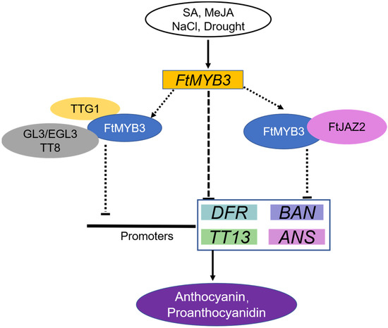 A proposed model depicting FtMYB3 regulation of anthocyanin and PA synthesis under different stresses. FtMYB3 is induced by SA, MeJA, NaCl and drought stress. FtMYB3 directly interacts with TT8, GL3, EGL3, and TTG1 and suppresses their transcriptional activator of DFR, ANS, BAN and TT13. Additionally, FtMYB3 may inhibit the synthesis of anthocyanins/PAs by interacting with FtJAZ2 protein.