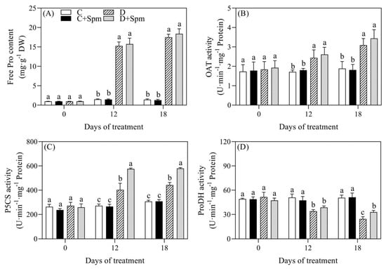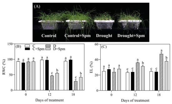 Seeds of creeping bentgrass cv. ‘PA-4’ were purchased from the Tee-2-Green company (Hubbard, OR, USA) and sown in plastic containers (24 cm length, 18 cm width, 9 cm depth) with sterile quartz sands in a controlled growth chamber (photoperiod cycle of 10/14 h light/dark, 21/18 °C day/night, 65% relative humidity, and 700 μmol m−2·s−1 PAR). After being germinated in distilled water for 7 days, the seedlings were cultured in Hoagland’s nutrient solution [] for 14 days. Plants were then moved carefully from quartz sands and cultivated in the Hoagland’s nutrient solution for 7 days of hydroponics. These plants were pretreated with or without 100 μmol/L Spm in roots for 3 days [,]. The Spm-pretreated and untreated plants were subjected to normal conditions or drought stress induced by 18% polyethylene glycol (PEG) 6000 (−0.5 MPa) that was dissolved in Hoagland’s nutrient solution for 18 days. The experimental design was completely random. Fresh nutrient solution or PEG solution was applied every day. Each treatment had four independent biological replicates and the experiment was reproduced four times, independently. Leaf samples were taken at 0, 12, and 18 days.