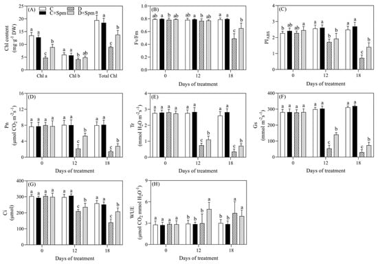Effects of Spm pretreatment on (A) total chlorophyll content (Total Chl), chlorophyll a (Chl a) and chlorophyll b (Chl b) under drought stress for 18 days; Effects of Spm pretreatment on (B) photochemical efficiency (Fv/Fm), (C) performance index on absorption basis (PIABS), (D) net photosynthetic rate (Pn), (E) transpiration rate(Tr), (F) stomatal conductance(Gs), (G) intercellular carbon dioxide concentration(Ci), and (H) water use efficiency (WUE) in leaves of creeping bentgrass under normal condition and drought stress. Vertical bars indicate ± SE of mean (n = 4). The “n = 4” indicates four independent biological replicates. Different letters above columns indicate significant difference at a particular day based on the LSD (p ≤ 0.05). C, well-watered control; C + Spm, well-watered control pretreated with Spm; D, drought stress; D + Spm, drought-stressed plants pretreated with Spm.