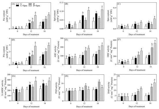 Effects of Spm pretreatment on (A) putrescine (Put) content, (B) spermidine (Spd) content, (C) spermine (Spm) content, (D) polyamines (PAs) content, (E) arginine decarboxylase (ADC) activity, (F) ornithine decarboxylase (ODC) activity, (G) S-adenosylmethionine decarboxylase (S-AMDC) activity, (H) polyamine oxidase (PAO) activity, and (I) diamine oxidase (DAO) activity in leaves of creeping bentgrass under normal condition and drought stress. Vertical bars indicate ± SE of mean (n = 4). The “n = 4” indicates four independent biological replicates. Different letters above columns indicate significant difference at a particular day based on the LSD (p ≤ 0.05). C, well-watered control; C + Spm, well-watered control pretreated with Spm; D, drought stress; D + Spm, drought-stressed plants pretreated with Spm.