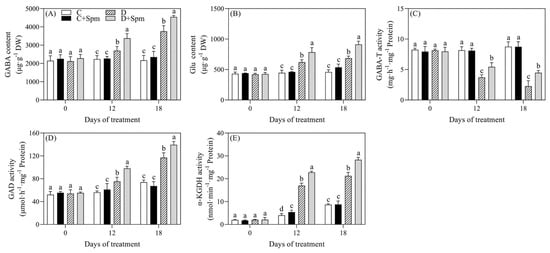 Effects of Spm pretreatment on (A) γ-aminobutyric acid (GABA) content, (B) glutamate (Glu) content, (C) GABA aminotransferase (GABA-T) activity, (D) glutamate decarboxylase (GAD) activity and (E) α-ketoglutarase(α-KGDH) activity in leaves of creeping bentgrass under normal condition and drought stress. Vertical bars indicate ± SE of mean (n = 4). The “n = 4” indicates four independent biological replicates. Different letters above columns indicate significant difference at a particular day based on the LSD (p ≤ 0.05). C, well-watered control; C + Spm, well-watered control pretreated with Spm; D, drought stress; D + Spm, drought-stressed plants pretreated with Spm.