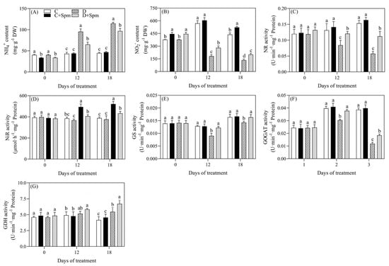 Effects of Spm pretreatment on (A) ammonium nitrogen (NH4+) content, (B) nitrite nitrogen (NO2−) content, (C) nitrate reductase (NR) activity, (D) nitrite reductase (NiR) activity, (E) glutamine synthetase (GS) activity, (F) glutamate synthetase (GOGAT) activity and (G) glutamate dehydrogenase (GDH) activity in leaves of creeping bentgrass under normal condition and drought stress. Vertical bars indicate ± SE of mean (n = 4). The “n = 4” indicates four independent biological replicates. Different letters above columns indicate significant difference at a particular day based on the LSD (p ≤ 0.05). C, well-watered control; C + Spm, well-watered control pretreated with Spm; D, drought stress; D + Spm, drought-stressed plants pretreated with Spm.