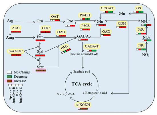Manipulation of PAs biosynthesis and metabolism could be an effective way to improve stress tolerance in plants. It has been found that salt stress improved enzyme activities of arginine decarboxylases (ADC) and ornithine decarboxylase (ODC) involved in PAs biosynthesis in salt-tolerant rice cultivar, but had no significant effect in salt-sensitive cultivar []. Exogenous GABA or chitosan (CTS) improved drought tolerance of white clover associated with enhancement of PAs synthesis and decline in PAs catabolism [,]. PAs also affected other metabolic pathways when plants responded to abiotic stress. For example, exogenous PAs treatment can enhance the accumulation of Pro in bermudagrass (Cynodon dactylon) under salt and drought conditions [] and also induced the expression of pyrroline-5-carboxylate synthetase 1 (P5CS1) which is a key gene involved in Pro synthesis in sour orange (Citrus aurantium) plants under oxidative and nitrosative conditions []. Exogenous Spd played an important role in activating nitrate reductase (NR) activity, thereby mitigating the inhibition of NR activity in wheat (Triticum aestivum) under drought stress []. Exogenous Spd decreased the toxic effects of ammonium nitrogen (NH4+) in cucumber seedlings via increases in the activities of glutamine synthetase (GS), glutamate synthase (GOGAT), and glutamate dehydrogenase (GDH) under Ca(NO3)2 stress []. In addition, diamine oxidase (DAO) performs a key role in the conversion of Put to GABA, and the application of aminoguanidine (AG), a DAO inhibitor, effectively inhibited the accumulation of GABA in the roots of German limonium (Limonium tataricum) []. Salt stress stimulated the DAO activity to improve accumulation of GABA in soybean (Glycine max) roots []. Under hypoxia condition, the DAO activity and PAs content increased significantly, which provided sufficient substrate for the formation of GABA in germinated faba bean (Vicia faba) []. However, it is still unclear how PAs metabolism interact with GABA, Pro and N metabolism to affect drought tolerance in plants.