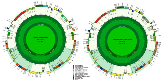 Genome map of the T. sphaerococcum and T. turgidum subsp. durum plastomes. The extent of the IR regions is represented by dark colors, which divide the cp genome into large (LSC) and small (SSC) single copy regions. Genes drawn inside the circle are transcribed clockwise, whereas those outside of the circle are transcribed counter-clockwise. Genes belonging to different functional groups are color coded. The light green in the inner circle corresponds to the GC content, whereas the dark green corresponds to the AT content.