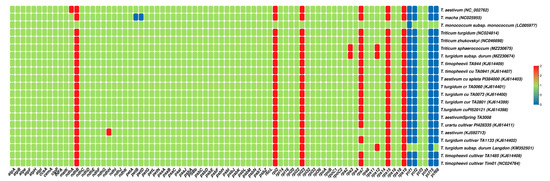 Summary of genes lost across Triticum plastomes. Blue color shows the missing genes, whereas the red color shows the genes duplicated in plastomes.