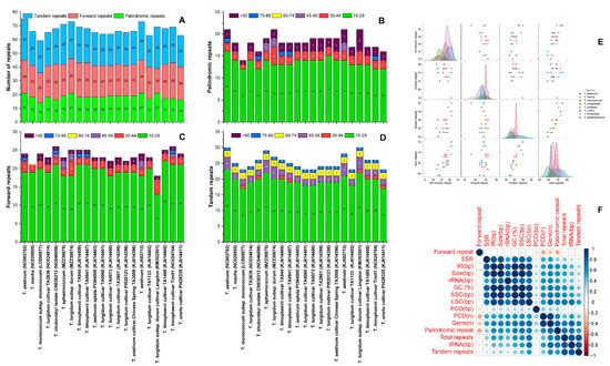 Analysis of repeated sequences in the 21 Triticum plastomes. (A) Total number of three-repeat types in all plastomes. (B) Number of palindromic repeats by length. (C) Number of forward repeats by length. (D) Number of tandem repeats by length. (E) Pair plot showing the distribution of repeats in Triticum species. (F) Correlation among different characteristics of Triticum plastomes.