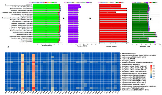 Analysis of simple sequence repeats (SSRs) in the 21 Triticum plastomes. (A) SSR numbers detected in the 25 species whole plastomes. (B) Frequency of identified SSRs in Triticum the small single copy (SSC) regions. (C) Frequency of identified SSRs in inverted repeat (IR) region. (D) Frequency of identified SSRs in the long single copy (LSC) region. (E) For T. turgidum subsp. turgidum, pairwise sequence distance of 42 protein-coding genes shared with the plastomes of related species.
