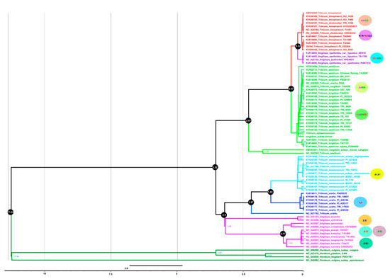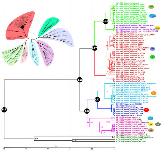 Maximum credible molecular chronogram (time tree) of Triticum from BEAST based on whole plastomes, with branch lengths proportional to time and lognormal fossil-based calibrations. The GTR + G substitution model was used with four rate categories and a Yule tree speciation model was applied with a lognormal relaxed clock model in BEAST. Different color branches represent Triticum species based on their genomes. The diploid, tetraploid, and hexaploid genomes are shown at the right side of the tree. The 95% highest posterior density credibility intervals are shown for the node ages in black circles (mya). Numbers indicate date estimates for different nodes. A geological time scale is shown at the bottom of the figure.