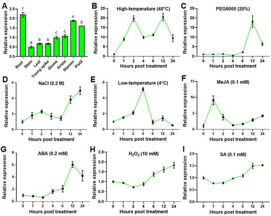By digging into published transcriptome sequencing data of wheat (TAM107) seedlings under normal growth conditions and heat stress for 6 h [], we identified a heat shock factor gene, TaHsfA2e-5D, which was highly up-regulated by heat stress and thus was selected for further functional characterization. Firstly, we investigated the expression profiles of TaHsfA2e-5D in different wheat tissues. As shown in Figure 1A, TaHsfA2e-5D was expressed in all parts of wheat plants examined; the highest expression was noted in the root, stamen and pistil, followed by that in the glume and arista, whereas the lowest expression was found in the leaf, young spike, and stem under normal growth conditions. Next, we explored the expression patterns of TaHsfA2e-5D in response to various abiotic stresses and phytohormones. Under a high-temperature, low-temperature and methyl jasmonate (MeJA) treatments, the expression levels of TaHsfA2e-5D were up-regulated rapidly and peaked at 2, 4 and 1 h, respectively (Figure 1B,E,F). TaHsfA2e-5D expression was induced by PEG6000 or abscisic acid (ABA) at 6 h post treatment, peaked at 12 h, and then decreased sharply (Figure 1C,G). Following NaCl stress, the TaHsfA2e-5D transcript increased gradually from 6 h (Figure 1D). For H2O2 and salicylic acid (SA) treatments, the responses of TaHsfA2e-5D were relatively weak, and its mRNA levels slightly increased after 6 h of treatment (Figure 1H,I). These results implied that TaHsfA2e-5D appears to be involved in different signal transduction pathways and may play an important role in various abiotic stress responses in plants.