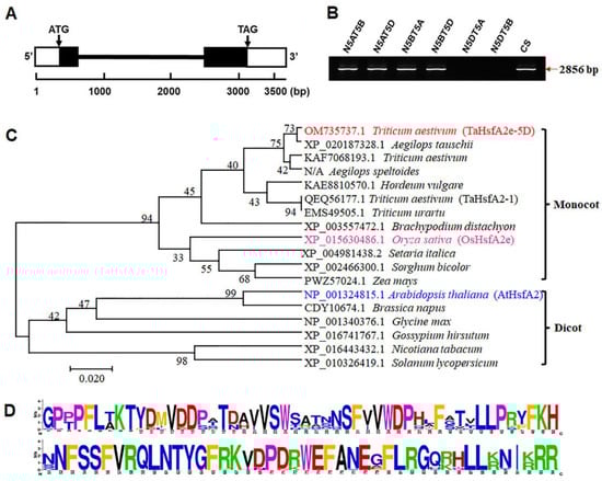 Genomic DNA and total RNA were isolated using the CTAB and TRIzol methods (Coolaber, Beijing, China), respectively. First-strand cDNA was synthesized using a Reverse Transcription System (Vazyme, Nanjing, China). Sequence BLAST search was performed through NCBI (https://www.ncbi.nlm.nih.gov/, accessed on 28 February 2022) and IWGSC (http://www.wheatgenome.org/, accessed on 28 February 2022) databases. The genomic and cDNA sequences of TaHsfA2e-5D were obtained from the DNA and cDNA of TAM107 by PCR with gene-specific primers. The chromosomal location of TaHsfA2e-5D was determined by PCR using chromosome specific primers with the DNA of CS NT lines as templates. All PCR reactions were performed using high-fidelity Tks Gflex™ DNA Polymerase (TaKaRa, Dalian, China) according to the manufacturer’s recommended procedures. The PCR products were constructed into the pEASY-Blunt cloning vector (TransGen, Beijing, China) for sequencing. Primer sequence information is presented in Table S1. DNAMAN8 software was used for sequence alignment. Cis-acting regulatory elements were predicted using PlantCARE (http://bioinformatics.psb.ugent.be/webtools/plantcare/html/, accessed on 28 February 2022). Phylogenetic tree was constructed using MEGA7 software, and sequence logos were analyzed by WebLogo (http://weblogo.berkeley.edu/, accessed on 28 February 2022) platform.