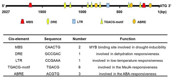 To understand the underlying mechanism responsible for the regulation of TaHsfA2e-5D expression, we isolated a 2027 bp DNA sequence upstream of the start codon of TaHsfA2e-5D using a PCR strategy. We searched for putative cis-acting regulatory elements in this sequence using PlantCARE (Figure 3). A number of stress-related elements were identified, including drought-responsive element (MBS), dehydration-responsive element (DRE), low-temperature-responsive element (LTR), MeJA-responsive element (CGTCA/TGACG-motif) and ABA-responsive element (ABRE).