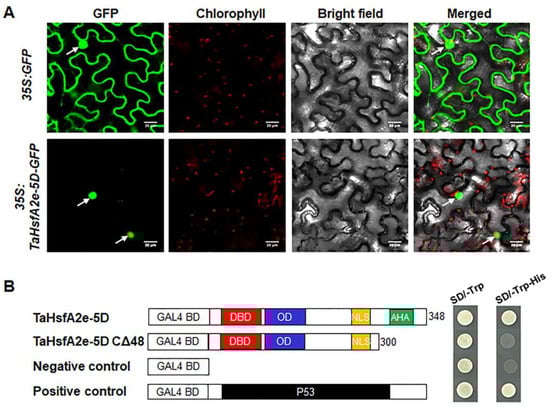 Domain analyses revealed that TaHsfA2e-5D possesses NLS and AHA motifs similar to other known HsfAs (Figure S1), indicating that TaHsfA2e-5D is likely to be a nucleus-localized transcriptional activator. In the assessment of subcellular localization of TaHsfA2e-5D through transient transformation in tobacco leaf epidermal cells, the green fluorescence of cells with GFP was distributed throughout the cell, whereas it was only observed in the nucleus of cells with TaHsfA2e-5D-GFP, verifying that TaHsfA2e-5D is a nucleus-localized protein (Figure 4A). The transactivation activity of TaHsfA2e-5D was evaluated with the GAL4 yeast system. As shown in Figure 4B, all transformants grew well on SD/-Trp medium. However, only the yeast harboring pGBKT7-TaHsfA2e-5D and pGBKT7-P53 constructs, but not the yeast carrying pGBKT7-TaHsfA2e-5D CΔ48 and pGBKT7 vectors, grew well on SD/-Trp-His medium, confirming that TaHsfA2e-5D functions as a transcriptional activator and the predicted AHA motif is required for its transactivation activity.