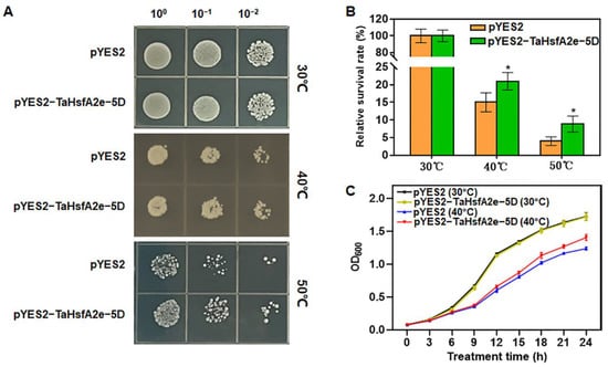 The aforementioned results indicated that the expression of TaHsfA2e-5D was remarkably induced by heat stress (Figure 1B). To confirm the function of TaHsfA2e-5D in heat stress responses, we used ectopic expression in yeast to study its effect on thermotolerance. Under normal growth conditions (30 °C), no obvious difference was observed in the growth status between the yeast transformed with pYES2 and that transformed with pYES2-TaHsfA2e-5D, and the growth curves of the two kinds of transformants almost overlapped (Figure 5A,C). However, after heat treatments (40 °C or 50 °C), the growth of both transformants was inhibited, but the pYES2-TaHsfA2e-5D transgenic yeast grew better and had higher survival rates compared with the pYES2 transgenic yeast (Figure 5A,B). Moreover, the OD600 values of pYES2-TaHsfA2e-5D transgenic yeast were obviously higher than those of pYES2 transgenic yeast after 9 h of treatment (Figure 5C). These results demonstrated that ectopic expression of TaHsfA2e-5D improves thermotolerance in yeast.