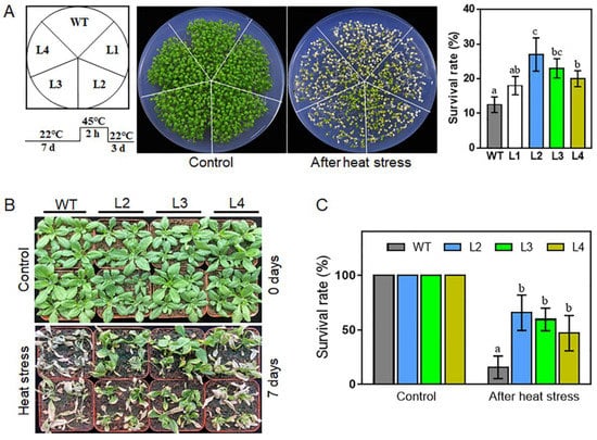Thermotolerance assays of WT and TaHsfA2e-5D overexpressing transgenic Arabidopsis lines. (A) Morphology and survival rates of WT and transgenic lines (L1, L2, L3 and L4) grown on MS agar plates after heat treatment. Seven-day-old seedlings were treated at 45 °C for 2 h and recovered at 22 °C for 3 days. (B,C) Comparison of thermotolerance among WT and transgenic lines (L2, L3, and L4) in soil. Phenotype (B) and survival rates (C) of WT and transgenic lines after heat stress at 40/32 °C (day/night) for 7 days. For each experiment, at least 20 plants per line were used; values are means ± SD from three independent measurements. Different lowercase letters above the bars denote significant differences at the p < 0.05 level.