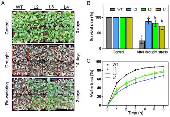 Comparison of drought tolerance among WT and TaHsfA2e-5D overexpressing transgenic lines. (A) Morphology and (B) survival rates of WT and transgenic lines (L2, L3 and L4) after drought treatment. The 21-day-old seedlings did not receive watering for 14 days until the plants withered. Afterwards, re-watering was applied, and survival rates were measured after re-watering for 2 days under normal conditions. Different lowercase letters above the bars denote significant differences at the p < 0.05 level. (C) Water loss rates of WT and transgenic lines. Values are means ± SD of three replicates.