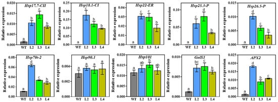 Expression of stress-related genes in WT and transgenic lines. Total RNAs were isolated from WT and transgenic plants grown for 10 days under normal conditions. Three biological replicates were used for each line. The Arabidopsis Actin2 gene was used as an internal standard. All data represent means ± SD. Different lowercase letters above the bars denote significant differences at the p < 0.05 level. Hsp17.7-CII (AT5G12030), Hsp18.1-CI (At5g59720), Hsp22-ER (At4g10250), Hsp25.3-P (At4g27670), Hsp26.5-P (At1g52560), Hsp70t-2 (At2g32120), Hsp90.1 (At5g52640), Hsp101 (At1g74310), GolS1 (At2g47180), and APX2 (At3g09640).