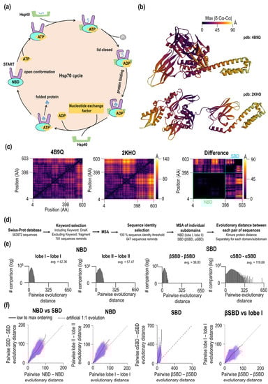 (a) Functional cycle of Hsp70. (b) Open and closed conformations of E. coli DnaK. The color of each residue is based on the maximum value of the difference of Cα-Cα distance (Å). (c) Heatmaps of Cα-Cα distances between each pair of residues in the open (avg. = 36.54 Å) and closed (avg. = 45.92 Å) conformations of E. coli DnaK and their differences obtained after subtraction (avg. = 14.12 Å). (d) Workflow of collection of sequences, selection and preparation steps for evolutionary distance analysis. (e) Histograms of pairwise sequence evolution distances in DnaK subdomains. (f) Correlation of evolutionary distances between domains/subdomains including a hypothetical equal rate of changes (dashed line).