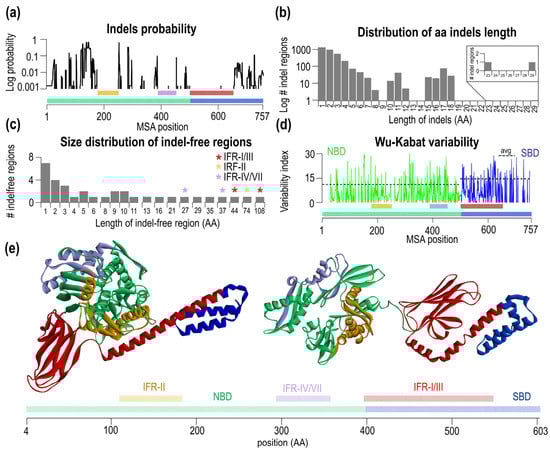 Identification and analysis of the three largest indel-free regions based on MSA of 647 sequences. (a) Probability of indel event for each MSA position. (b) Distribution of aa length of the indels in MSA (c) Size distribution of IFRs. The split indel-free regions are marked with asterisks. (d) Wu-Kabat variability of the MSA with NBD avg. variability of 11.19 and SBD variability of 14.64. The positions of MSA with a gap in the consensus sequence were not analyzed. (e) Open (pdb: 4B9Q), closed (pdb: 2KHO) conformations and schematic sequence of E. coli DnaK with the largest IFR (red) (E. coli numbering 397–548 aa), the second-largest (orange) (E. coli numbering (110–183 aa) and the third largest (purple (E. coli numbering 294–357 aa) indel-free regions.