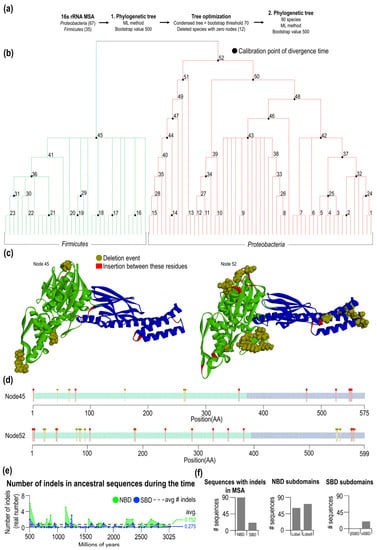 To analyze how indels are formed in evolution, we conducted ancestral sequence reconstructions. Notably, the other selection is needed to reconstruct the phylogenetic tree reliably. Hence, we conducted a deeper manual selection of sequences (see Supplementary Materials, Supplementary Figure S3 and Table S2). We selected bacterial sequences belonging to members of the two most frequent bacterial phyla—Proteobacteria (67 species) and Firmicutes (35 species), which resulted in a new set of 102 cured sequences. To construct a maximum-likelihood phylogenetic tree, 16S rRNA were collected, aligned and used as input for the calculation (Figure 3a). From this step, the first phylogenetic tree (Supplementary Figure S4) was calculated with 500 bootstrap replicates. Subsequently, a condensed tree was calculated with a bootstrap threshold of 70%. After this step, 12 sequences did not have any node and were therefore deleted (Supplementary Figure S5). A new phylogenetic tree was calculated from 90 sequences (Supplementary Table S3), and its condensed form is shown in Figure 3b. In this condensed tree, there are 52 nodes at different tree depths. For each node, we calculated an ancestral sequence (see Methods). For the two oldest sequences at nodes 45 and 52, we predicted the three-dimensional structure of these ancestral proteins using Robetta from David Bakers lab [23]. We calculated the average error of the predicted 3D structures from errors at each position. The calculation of error per residue is based on coordination distances (in Å) of residues Cα of predicted and native structures. The overall error of the model is 0.69 Å and 0.75 Å for nodes 45 and 52, respectively. The reliability of the structural determination at arbitrary residue, the reader is referred to Supplementary Figure S6. For each ancestral sequence, we tracked insertion and deletion events in Firmicutes (node 45) and Proteobacteria (node 52). This tracking made it possible to analyze indel events in Gram-negative and Gram-positive phyla. In Figure 3c,d, indel events are mapped into 3D and primary sequence of node 45 and node 52 ancestral proteins. For node 45, there are 15 NBD and 6 SBD indel events. In the NBD of node 45, we found three regions where insertion occurred and eight positions where deletion events occurred. Only insertions were observed for the C-terminal region of NBD (res. greater than 357–358), while indel-free region IFR I/III is preserved. As seen in the 3D model of node45, deletion events occurred at the outer surface parts of the protein, as observed in general. Insertions are observed in the loops connecting secondary structure elements. For node 52, there are 38 NBD and 12 SBD indel regions. In the NBD of node 52, we found nine regions where the insertion occurred and 24 positions where deletion events occurred. In the SBD of node 52, again, the indel-free region IFR I/III is preserved, and at the C-terminal end of the SBD, we found both insertions and deletions (Figure 3c,d, node 52). 3D structural mapping of indel regions revealed that insertion and deletion occurred within structural elements.