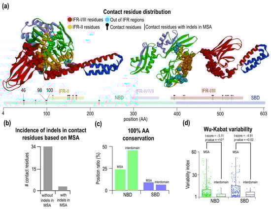 Interestingly, interdomain contact pairs are found at high frequency in large indel-free regions. As mentioned before, three IFR can be identified in the Hsp70 (red IFR-I/III, orange IFR-II, and light purple IFR-IV/VII). Interdomain residues are located only in the two largest IFRs, IFR-I/III in the SBD and IFR-II in the NBD. The region IFR-IV/VII does not contain any interdomain residue and is not involved in the allosteric change from open to a close form of Hsp70. Aside from large IFR, a minority of interdomain contacting residue is located in the smaller indel-free regions. There are eight residues outside of large IFRs, and three out of these are located within a position in the MSA where indels happened. Figure 4b summarizes this result—34 residues are in IFR, and three are in the indel positions. Next, we analyzed the level of conservation of the residues forming interdomain contacts from the NBD Figure 4c. We found that these contacts contain more conserved residues, 45%, than 24% conserved residues on an average position in the MSA. This is not observed for the SBD residues involved in the interdomain contacts; a roughly similar (6.67%) number of conserved residues are present as on MSA average (9.31%). This finding is surprising and may indicate that SBD residues must not be conserved to pair with the NBD residues. We wondered whether the variability of these residues is affected and hence some preference for the conserved NBD residues at all. Using our new dataset of 90 Hsp70 sequences, we calculated Wu-Kabat variability (Figure 4d). As expected, the NBD Wu-Kabat variability for ATP-specific interdomain residues was lower than on average (MSA—8.31; interdomain—3.62). In the SBD, we found that the variability of the residues is much lower than on average (MSA—11.73; interdomain—5.33). This indicates that to contact conserved NBD interdomain residues, the SBD residues do not need to be conserved; however, their variability decreased, indicating rather partial specificity of the interdomain SBD residues. We validated the significance of the observed differences between variability interdomain contacts vs. intradomain residues by the Welch’s t-test, which takes into account different sample values and different class variance (Figure 4d, for the NBD p < 10−5 and for the SBD p < 2 × 10−2).