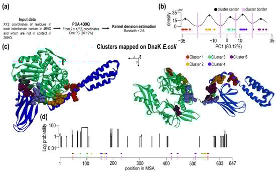 Based on previous findings, one may conclude that interdomain contacts may or may not contain conserved residues and hence the contacts can have different contribution to the interface. We attempted to sub-divide contacts based on their spatial/geometrical properties and correlate with the presence of conserved residues. To this end, we analyzed pairs of residues forming overall 31 contacts using principal component analysis followed by the analysis of the existence of “pair clusters” by kernel density estimation (Figure 5a). Based on the PC1 values, there is a clear tendency of some residues to be grouped around specific PC1 values, i.e., there is increased local density of values. Such agglomerates of 1D points we termed as clusters and analyzed accordingly. Using kernel density estimation, five clusters have been identified, and they are well separated from other density points (Figure 5b). Residues belonging to different clusters and conserved residues are summarized in Table 1. Contacts and residues belonging to different 1D clusters are shown in Figure 5c in the open and closed form of Hsp70.