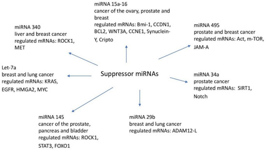 For many years, it was thought that the expression of miRNA in cancer cells was primarily reduced. Only a comparison of the miRNA profile of normal and cancerous tissues showed significant overexpression of some miRNAs [93]. Depending on the function of miRNAs in the development of tumors, they are classified as: suppressor miRNAs (inhibiting the expression of oncogenes or genes that induce apoptosis) and oncogenic miRNAs (activating oncogenesis or inhibiting the expression of suppressor genes) [94]. It should be emphasized that this classification is a significant simplification, because in the case of many miRNAs (e.g., miR-155, miR-125b), the effect of their activity depends on the total activity of regulated genes [94].