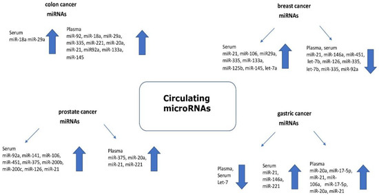 Circulating microRNAs as potential cancer biomarkers (the arrow indicates the expression level).