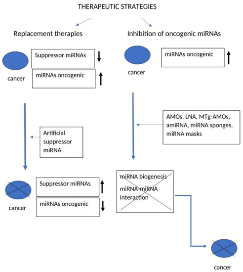 Monitoring the changes in the expression profiles of chosen miRNAs could help in early identification of cancer cells and serve as a prediction factor of the disease or treatment. Two therapeutic strategies using miRNAs have been developed that potentially inhibit cancer development (Figure 3).