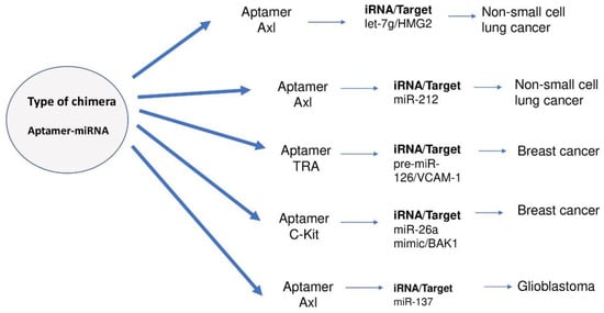 Potential therapeutic use may have RNA aptamers [168,169]. Aptamers are short, single-stranded nucleic acid molecules that adopt a strictly defined tertiary structure, which is responsible for the selectivity of their interaction with specific ligands, e.g., with nucleic acids, peptides, proteins or low-molecular compounds. Tumor suppressor miRNAs have gained importance in anticancer therapies. The generation of the aptamer-miRNA chimera to direct the delivery of let-7g miRNA to the cancer cell has been described [170]. GL21. T aptamer was used, which blocks the activity of the oncogenic tyrosine receptor Axl kinase and demonstrates the specificity of GL21. Targeted T-let aptamer-miRNA chimera by increased let-7g accumulation in Axl-expressing A549 cells, but not in cells lacking AXL MCF-7. After systemic administration of aptamer-miRNA chimera in immune-deficient mice with an A549 NSCLC-derived tumor, there was downward adjustment of the target 7g HMGA2, as well as inhibition of tumor growth [170].