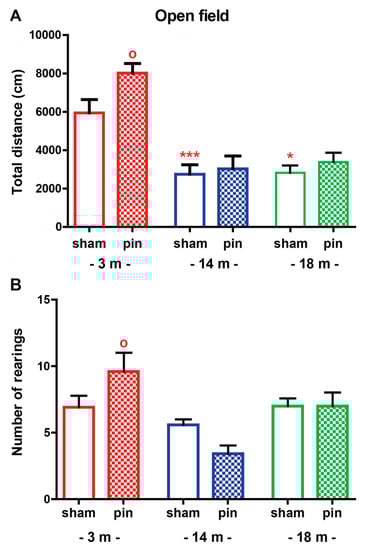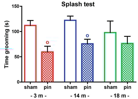 The effect of pin on grooming frequency of 3-, 14- and 18-month-old rats tested in the splash test. Data are presented as mean ± S.E.M. o p = 0.011, 3-month-old pin compared to matched sham group; o p = 0.023, 14-month-old pin compared to matched sham group. 3-month-old rats—red; 14-month-old rats—blue; 18-month-old rats—green.