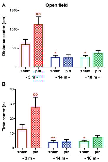 The effect of pin on distance traveled in the center (cm) (A) and time spent in the center (B) for 3-, 14- and 18-month-old rats tested in the open field test. Data are presented as mean ± S.E.M. * p = 0.013, * p = 0.048, 14- and 18-month-old rats, respectively, compared to 3-month-old rats; 3-month-old pin rats compared to matched sham rats (A); ** p = 0.003 and * p = 0.026, 14- and 18-month-old rats, respectively, compared to 3-month-old rats; oo p = 0.002 3-month-old pin compared to matched sham group (B). 3-month-old rats—red; 14-month-old rats—blue; 18-month-old rats—green.