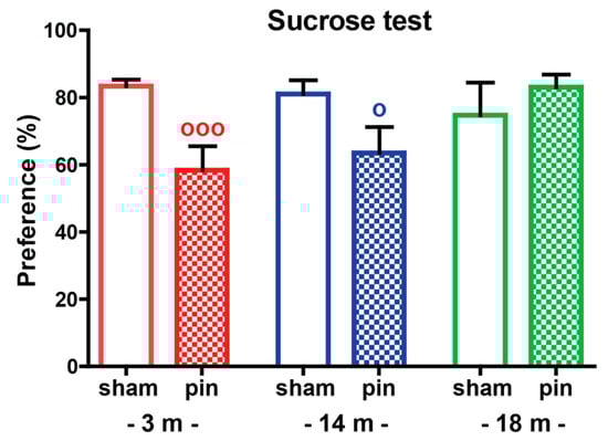 The effect of pin on preference to drink sweet solutions (anhedonia) of 3-, 14- and 18-month-old rats tested in the sucrose preference test. Data are presented as mean ± S.E.M. ooo p = 0.001, 3-month-old pin compared to matched sham group; o p = 0.021, 14-month-old pin compared to matched sham group. 3-month-old rats—red; 14-month-old rats—blue; 18-month-old rats—green.