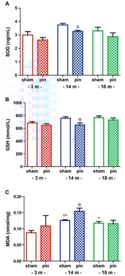 The effect of pin on SOD activity (A), GSH level (B) and MDA level (C) in the hippocampus of 3-, 14- and 18-month-old rats tested in ELISA. Data are presented as mean ± S.E.M. * p = 0.0284, 14-month-old sham compared to matched 3-month-old group; o p = 0.0108, 14-month-old pin compared to matched sham group (A); o p = 0.023, 14-month-old pin compared to matched sham group (B); ** p = 0.006, 14-month-old sham compared to matched 3-month-old group; * p = 0.012, 18-month-old sham compared to matched 3-month-old group; o p = 0.05, 14-month-old pin compared to matched sham group (C). 3-month-old rats—red; 14-month-old rats—blue; 18-month-old rats—green.