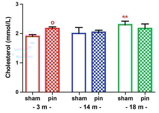 The effect of pin on cholesterol levels in serum of 3-, 14- and 18-month-old rats. Data are presented as mean ± S.E.M. ** p = 0.007 18-month-old sham rats compared to matched 3-month-old rats; o p = 0.0101, 14-month-old pin compared to matched sham group (A); o p = 0.023, 14-month-old pin compared to matched sham group (B); ** p = 0.0055, 14-month-old sham compared to matched 3-month-old group; 18-month-old sham compared to matched 3-month-old group; o p = 0.012, 3-month-old pin rats compared to matched sham group. 3-month-old rats—red; 14-month-old rats—blue; 18-month-old rats—green.