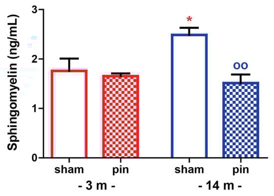 The effect of pin on sphingomyelin levels in the hippocampus of 3- and 14-month-old rats. Data are presented as mean ± S.E.M. * p = 0.032, 14-month sham compared to 3-month-old rats; oo p = 0.003, 14-month-old pin compared to matched sham group. 3-month-old rats—red; 14-month-old rats—blue; 18-month-old rats—green.