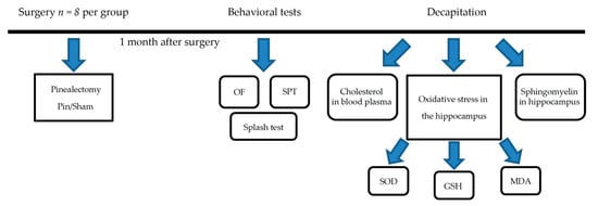 A description of the steps in the experimental protocol is shown in Figure 8. The rats were evenly distributed in six groups: sham-operated and groups with pinealectomy (pin) aged 3, 14 and 18 months. The surgical procedure for the removal of the pineal gland was carried out as described in our previous studies [,,]. Previously, we reported that removal of the pineal gland decreases the melatonin level in plasma, thereby leading to the abolition of the circadian pattern of hormonal release []. In brief, ketamine and xylazine were injected at a dose of 40 mg/kg (intraperitoneally, i.p.) and 20 mg/kg (intramuscular, i.m.), respectively, in the youngest groups. A dose of 60 mg/kg, i.p., and 30 mg/kg, i.m., respectively, was administered in rats aged 14- and 18-month-old. The fully anesthetized rats were fixed on a stereotaxic apparatus for a surgical procedure with pineal gland removal. In brief, after craniotomy (a small piece of the skull along with the suture lambda) by a dental drill, the gland, located beneath the venous sinus, was rapidly extracted via fine forceps. The procedure conducted on sham rats was the same except for pineal gland removal. Post-surgical action with an injection of antibiotics for three days was accomplished for all rats.