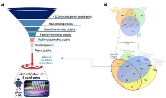 We used a systematic discovery strategy in which the human proteome (originated from ~20,000 protein-coding genes []) was visualized at the top of a giant funnel. Several in silico filters were cross-placed at different heights (Figure 1). Proteins moving down in the funnel reach a thicker grade of selectivity and specificity. In the approach, the in silico filters are represented by Venn diagrams used to apply selection criteria at the bio-datasets, consequently obtaining the most selective sub-bio-datasets. The full description of the strategy is presented in Supplementary Materials—SM2. By using the described strategy, we identified some proteins as candidate biomarkers for liver fibrosis. These markers fulfilled the following desired characteristics: (1) candidates must participate in the acquisition of myofibroblast phenotype; (2) be expressed in liver tissue; (3) the expression must be modified during fibrosis; and (4) must be secreted and measurable in plasma. From this analysis, 35 proteins were identified as putative candidates, excluding collagen proteins or other extracellular matrix components, since they might be stabilized in the surrounding area of liver cells without the release into the bloodstream. Thus, we obtained 29 candidate biomarkers (Table 1). Five randomly selected proteins of the total candidates were evaluated in this study (Figure 1).