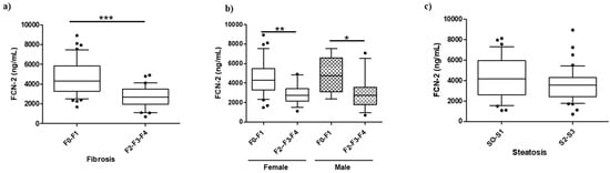 Boxplot for FCN-2 measurements in the morbidly obese discovery cohort. (a) Plasma abundances of FCN-2 determined by ELISA in MO subjects stratified by fibrosis stage, (b) MO stratified by gender and fibrosis stage, and (c) MO stratified by steatosis grade. *** Significant at p < 0.001, ** significant at p < 0.01, and * significant at p < 0.05.